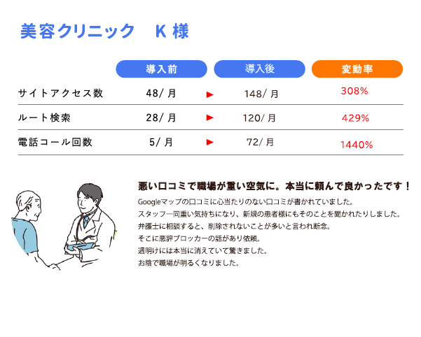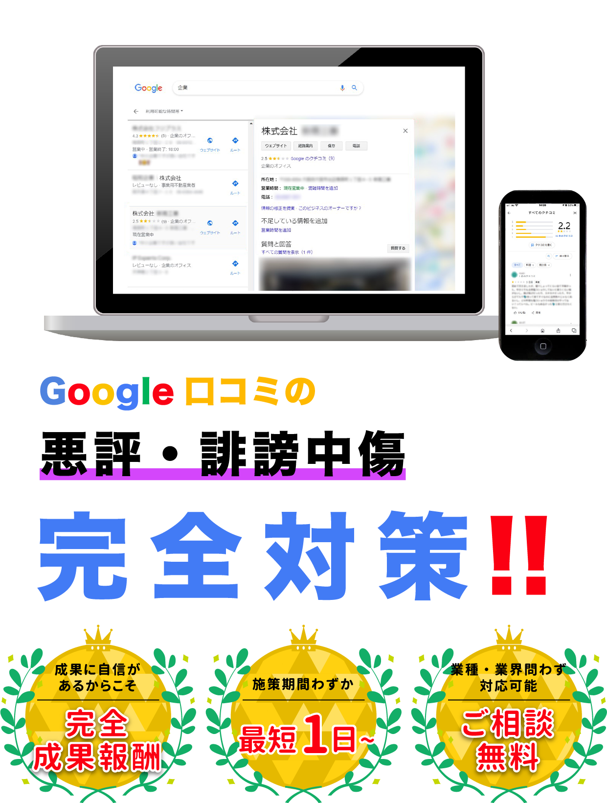 対策開始より、最短1日、通常3~4日ほどの期間で完了しております。※Googleの反映に時間がかかる場合があります。