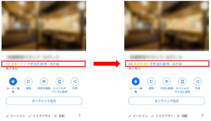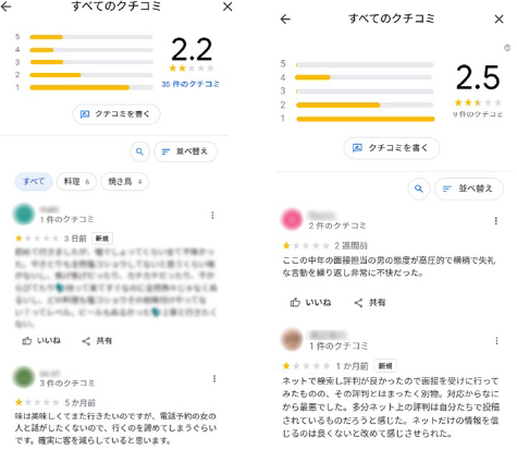 多くのユーザーが利用するGoogle口コミにおいて評価が悪かったり、悪評が放置されていたりすると新規客獲得の悪影響となります。ネガティブな評価・口コミは監視し対策していく必要があります。